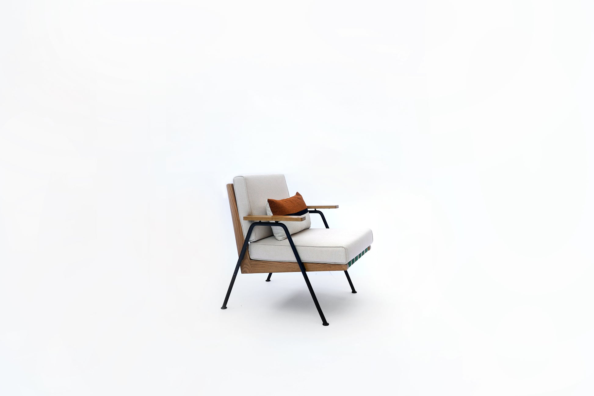 A sleek lounge chair blending metal, wood, and soft upholstery, designed with clean lines and timeless comfort for modern interiors.