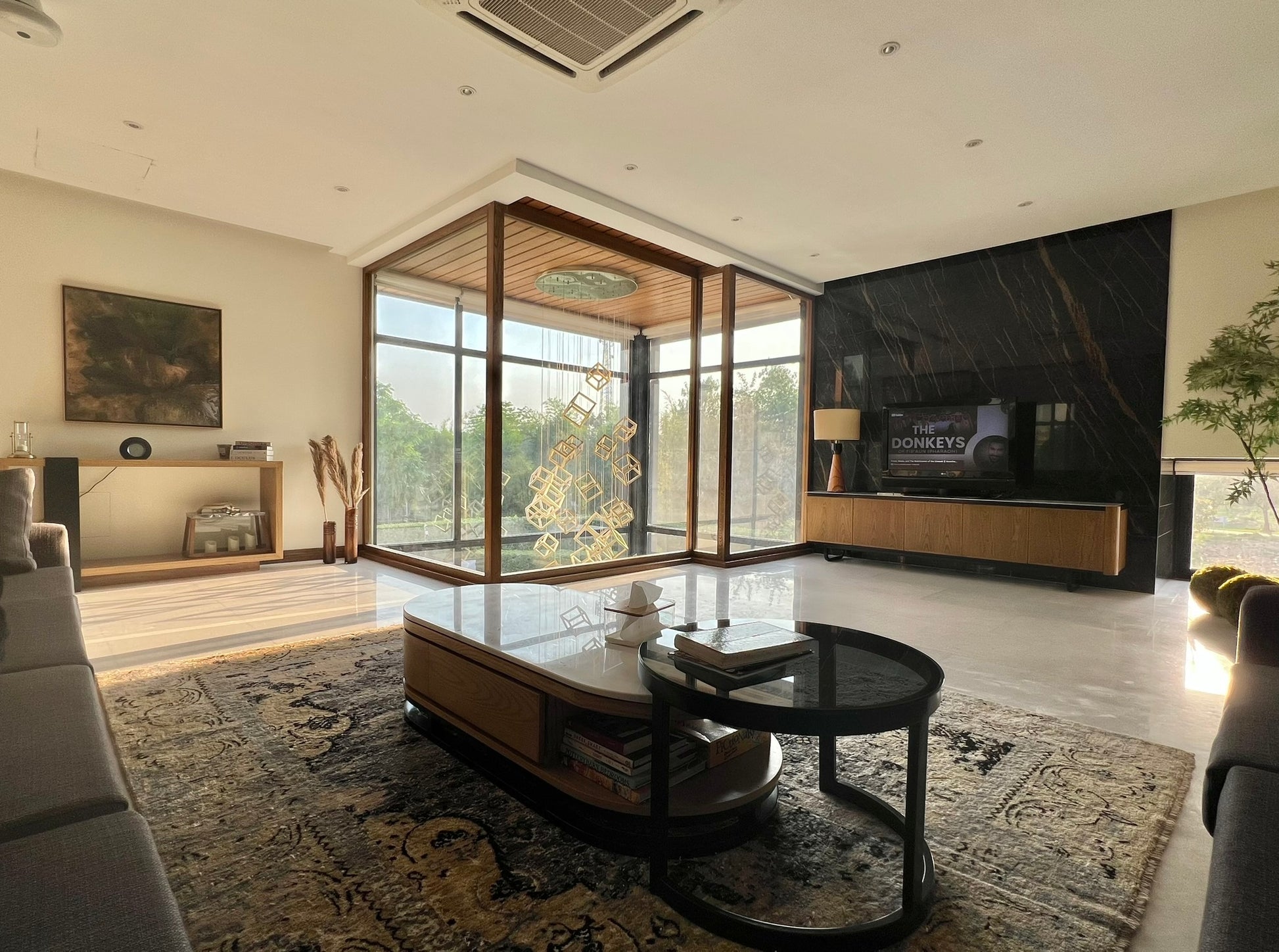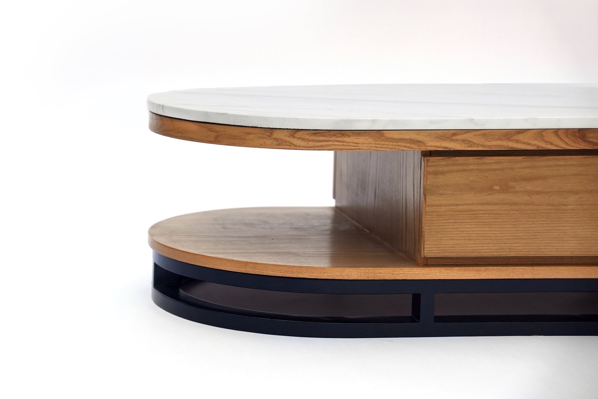 The Volaris Coffee Table is a modern masterpiece featuring a curved volakas marble top with wooden drawers, a sturdy iron base, and a connected round glass table with a sleek metal frame. This versatile design seamlessly blends natural and industrial elements, offering style and functionality for contemporary living spaces.